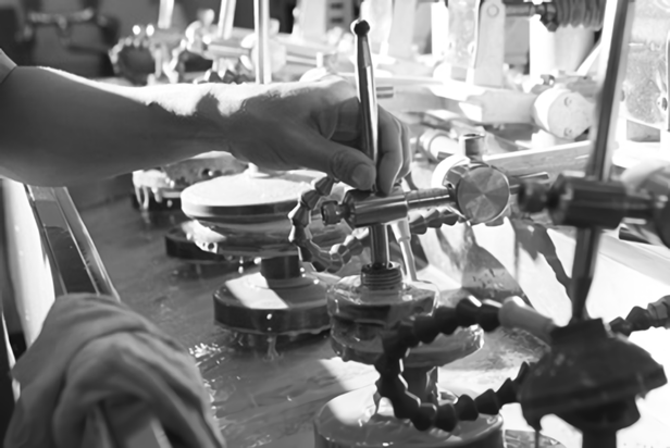 素材、研磨剤、磨きの角度やスピード、様々な要件が異なるレンズ製造は、機械任せにできず、職人の経験による細かな調整が必要。一瞬たりとも気が抜けない。