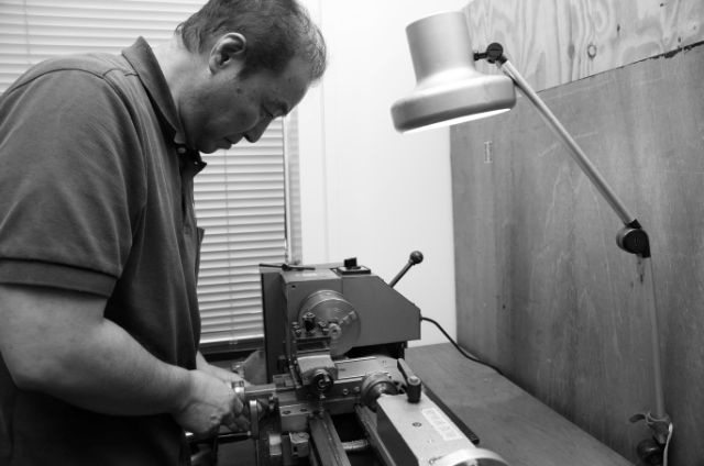 機械加工室で作業する名取。入手が難しくなったレンズ部品などをここで自作し数々のレトロレンズを生き返らせてきた。