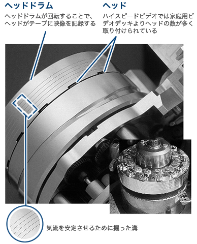 解決策として注目したのが、高速回転するヘッドドラムの側面にある“溝”だ。この“溝”は空気層を調整するためのもので、そもそも民生用のビデオデッキでもこの空気層をうまくコントロールすることで、テープのヘッドドラムへの貼りつき防止と、テープとヘッドが最適な距離で接触し安定した映像信号の記録/再生を実現している。この溝を工夫して気流の乱れを解決できないか。問題解決のために試行錯誤を繰り返す日々が続いた。その結果、ミクロン単位の精度で溝に微細な加工を施すことによって、テープとヘッドドラムの間の空気層を確実に安定させることが可能となった。ドラムというVCRの重要基幹部品の製造技術を自社内に確立したことで、新たに持ち上がった問題を解決する際に他社に頼らずとも、自社開発という選択肢で解決が可能となった。