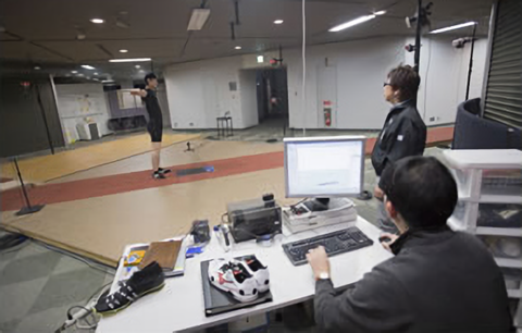 古川 | おっしゃるとおりですね。たとえば膝への負担を軽減できるような新しいシューズを開発するとします。衝撃吸収性の高い素材、あるいは新構造のソールがあったとして、そのソール自体が持つ衝撃吸収性だけでなく、シューズという製品全体で走りにどのような影響がでるかを見極めなくてはなりません。そうした時にこのシステムならば地面に着地した時、あるいは地面を蹴り上げる時、人体のどこにどれくらいの力が加わっているか、それが走りにどう影響しているかを知ることができる。その意味では開発のみならず新素材や新機構が確かに運動性能を高めていることを示す、商品機能のエビデンスとしてのデータを得ることもできるわけです。 |