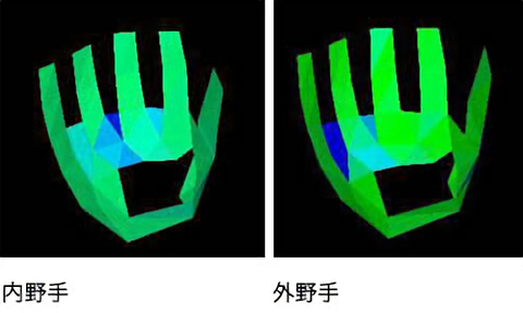 古川 | 野球グラブの開発例が分かりやすいかもしれません。 これまでグラブは操作性を高めるため、裏革を補強して力を伝わりやすくする、指の付け根部分に切り込みを入れて曲げやすくするなどの工夫が施されてきました。それらは先ほど申し上げたとおり理にかなっているのですが、一方で私たちはこのシステムを使い、捕球時のグラブの変形を三次元計測し、手の動きを阻害しているポイントを見つけることで、より捕球しやすいグラブ設計のヒントを考えました。 |