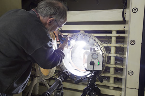 クライネ | 古くからあるシュリーレン撮影は、後ろからのみの光(バックライト)で空気などの流れを捉える、いわば影絵のようなものでした。もちろんそれはそれで見えなかった物を捉えたのですから、さまざまな分野の研究に貢献してきました。ただ私はもっと知りたい、もっときれいに撮りたいと思った。そこで従来法とは異なる被写体の正面、カメラ側からも光を当てるフロントライティングでの撮影法を研究しました。バックライトで流れを捉えるとともに、表からの光で物体の挙動も見る。そのためには強さや角度など微妙な光のバランスを試行錯誤してきました。 シュリーレン撮影自体は非常に長い歴史を持つ技術。ですからすでに完成されたものと思われるかもしれません。けれどまだまだ改良の余地はたくさんある。それにはハイスピードカメラの技術進化はもちろん必要ですし、撮影法をつきつめていくことで、見えなかったものをもっともっと見たいと思いますね。 |