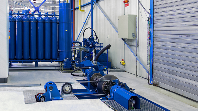 車両や試験台車をけん引するためのけん引装置です。通常のけん引装置よりコンパクトな電気式けん引装置や高電圧な電力供給が難しい施設でも運用可能な油圧式けん引装置があります。