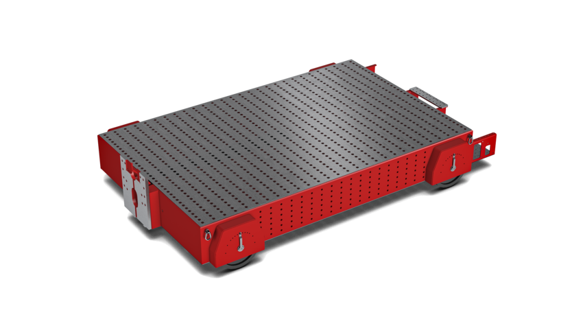 最大積載重量は2,500kg、2,800× 1,800mmの面に50×100mm間隔で取り付けボルト穴が用意されているので試験治具を取り付けることができます。また、側面にもボルト取り付け穴があり、アウトリガーや計測装置などを取り付けることができます。