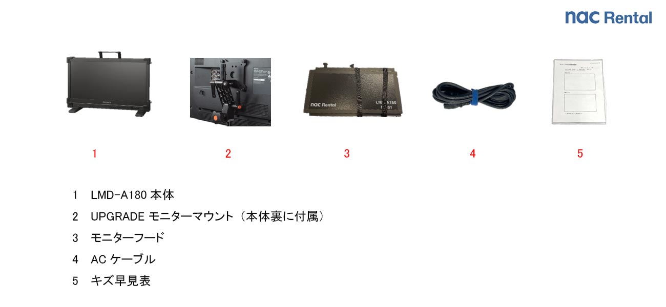 構成品 SONY LMD-A180本体(保護パネル/Vマウントバッテリーアダプター) 1 UPGRADE モニターマウント(本体裏に付属) 1 モニターフード 1 ACケーブル 1 キズ早見表 1 オプション タイヤ付きモニタースタンド ¥1,500